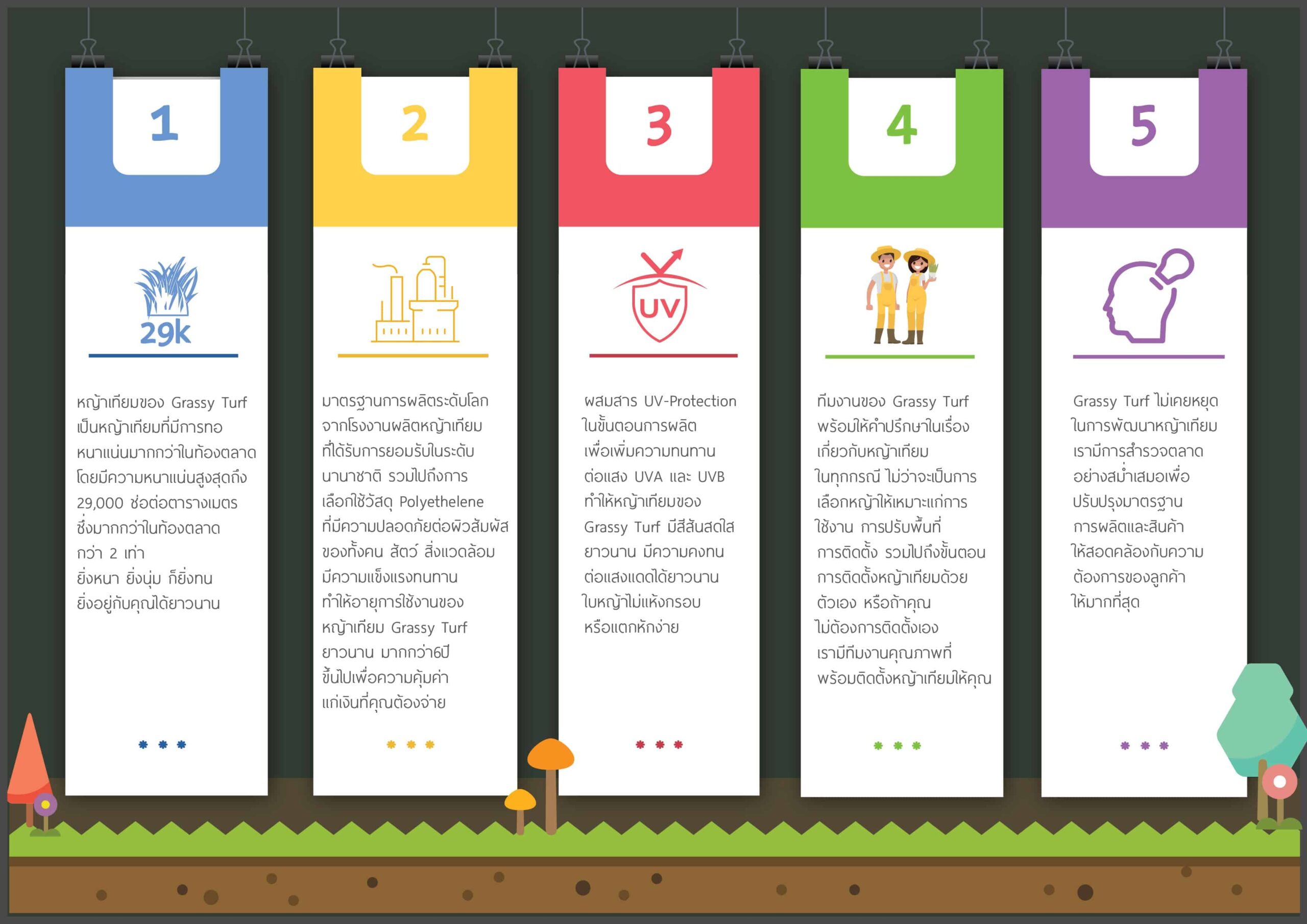 หญ้าเทียมของเราผสมสาร UV-Protection ในขั้นตอนการผลิตเพื่อเพิ่มคววามทนทานต่อแสง UVA และ UVB ทำให้หญ้าเทียมของ Grassy Turf มีสีสดใสมีความคงทนต่อแสงแดดได้ยาวนาน ใบหญ้าไม่แห้งกรอบหรือแตกหักง่าย - ทีมงานคุณภาพ